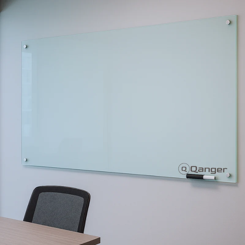 Pizarra de vidrio templado 0.90×1.20 m con 4 soportes de acero. Ideal para oficina, aula o casa. Superficie blanca fácil de limpiar y muy resistente.